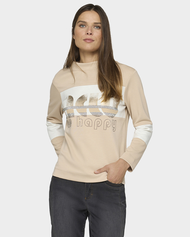 Пуловер с блестящим принтом, стразами и ворот...