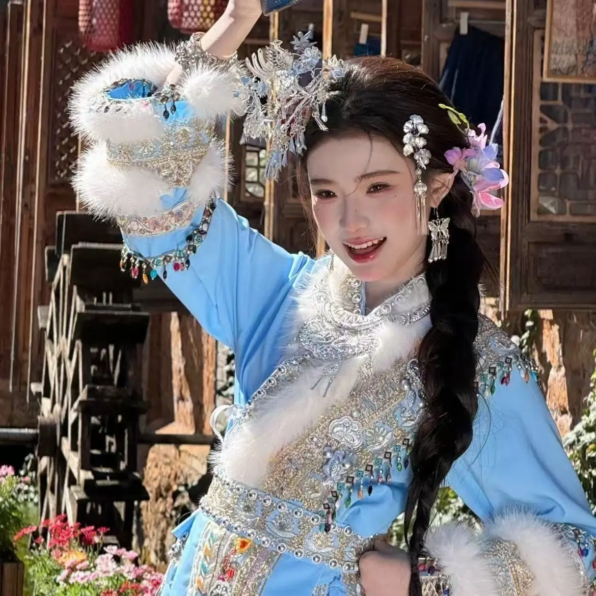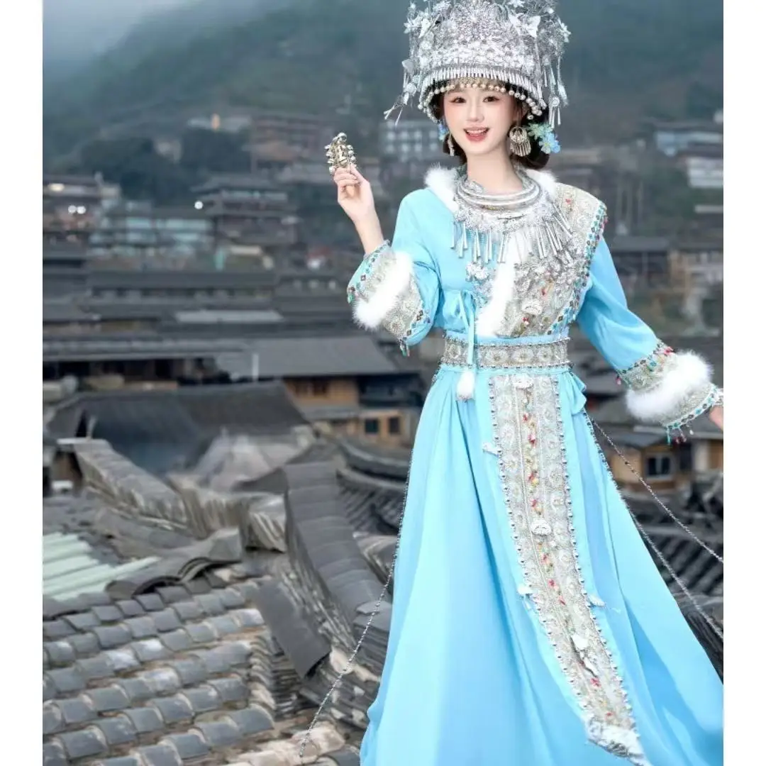 Vintage Plush Edge Blue Hmong Costume for Wom...