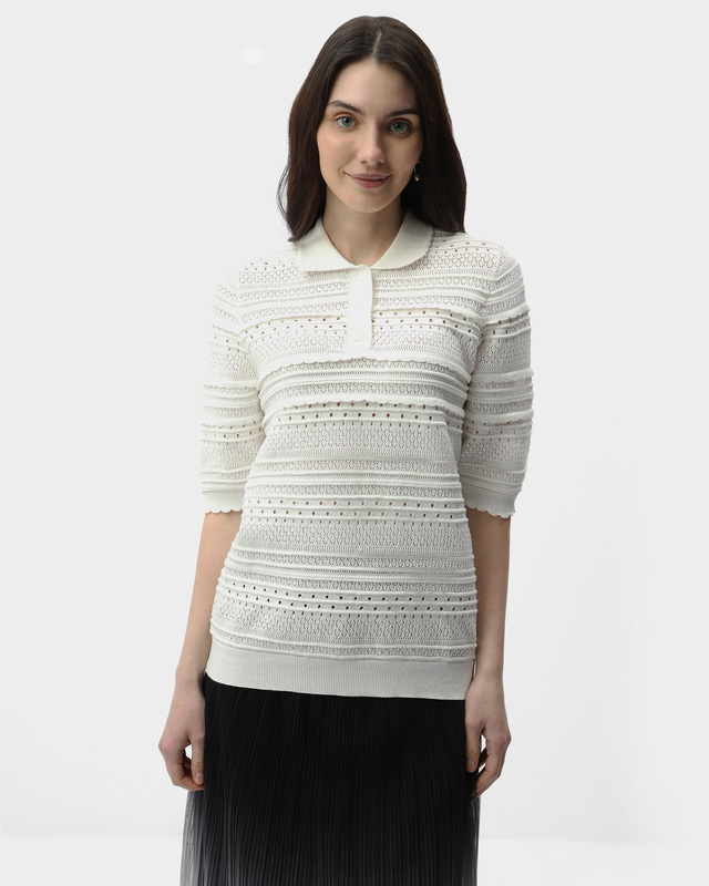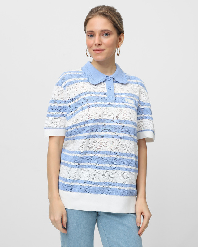 Поло ажурной вязки с контрастными полосками и...