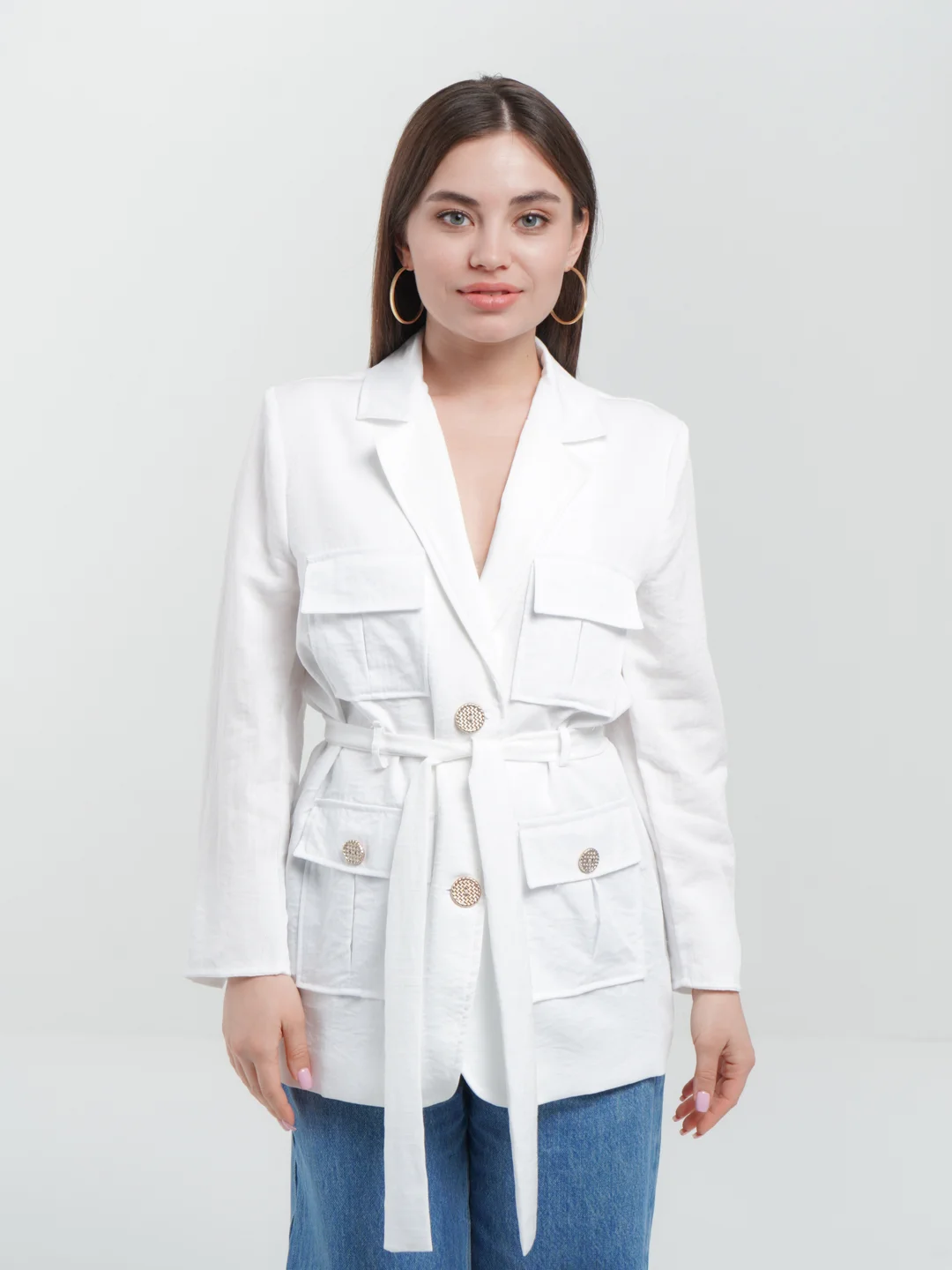Пиджак женский с ремнем и карманами классичес...