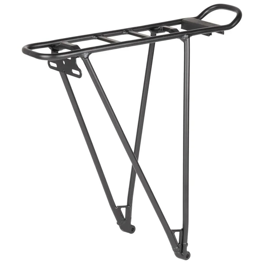 Low-riding front rack compatible with most bikes that have suspension forks and/or disc brakes.