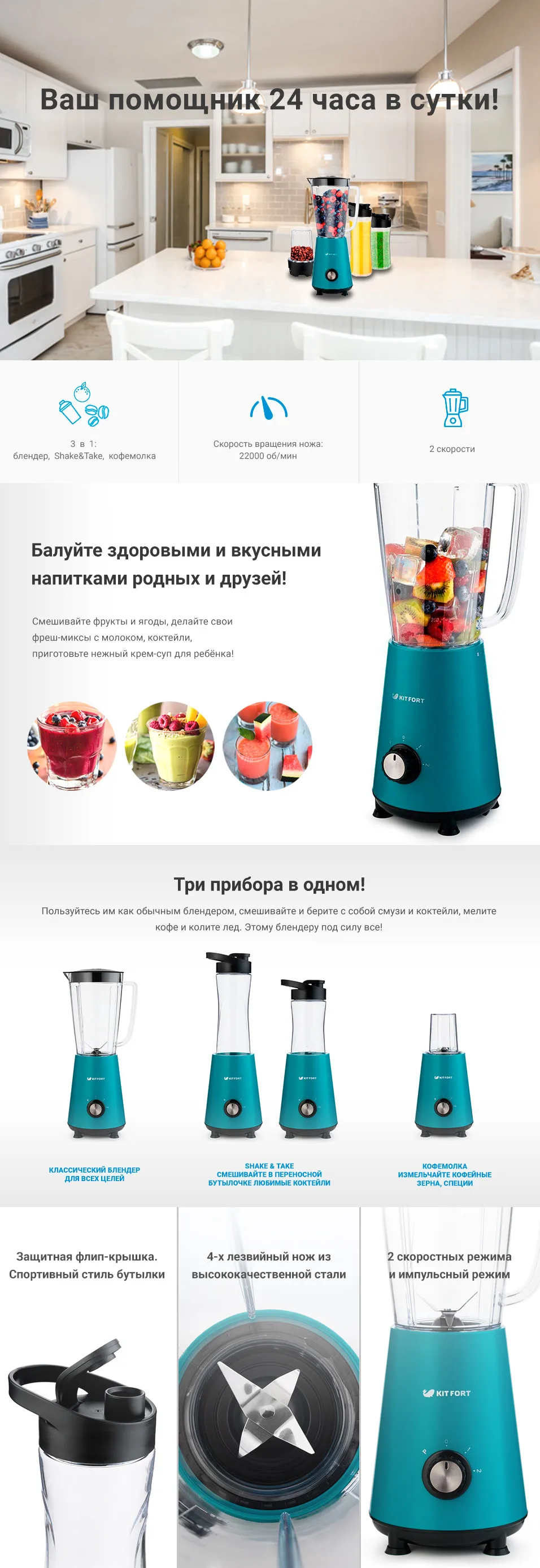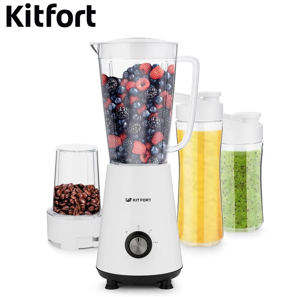 Блендер Kitfort КТ-1340 сочетает в себе функции трех устройств. Это стационарный блендер с функцией Shake & Take (шейк энд тэйк) и портативными бутылками, а также кофемолка.
