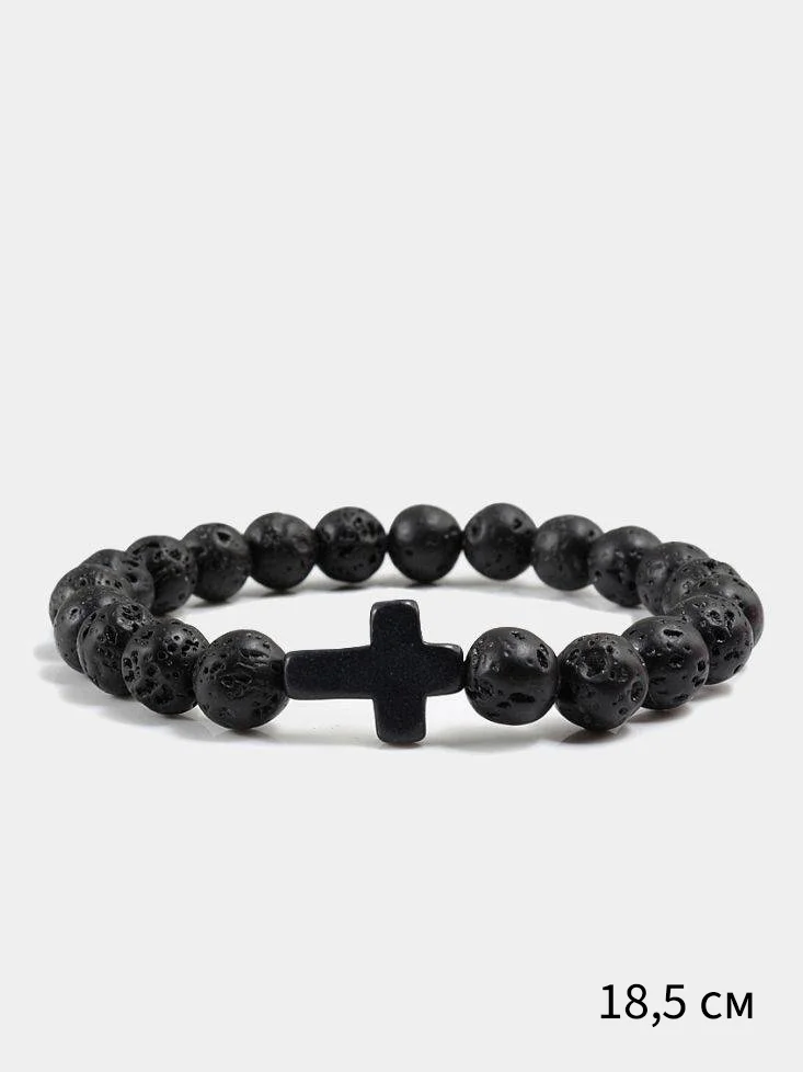 Стильный браслет из вулканического камня и гладких искусственных камней. Браслет на резинке.