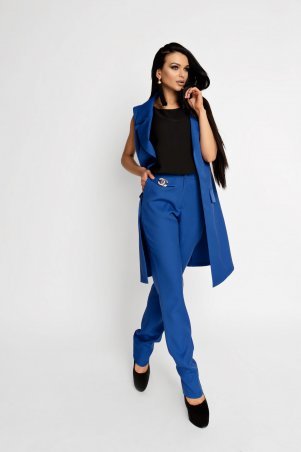 +ПодробнееЭлегантный костюм с брюками. Жакет с открытыми плечами и воланом по краю придает женственности, застегивается на потайные пуговицы. Брюки прямого кроя, заужены к низу.