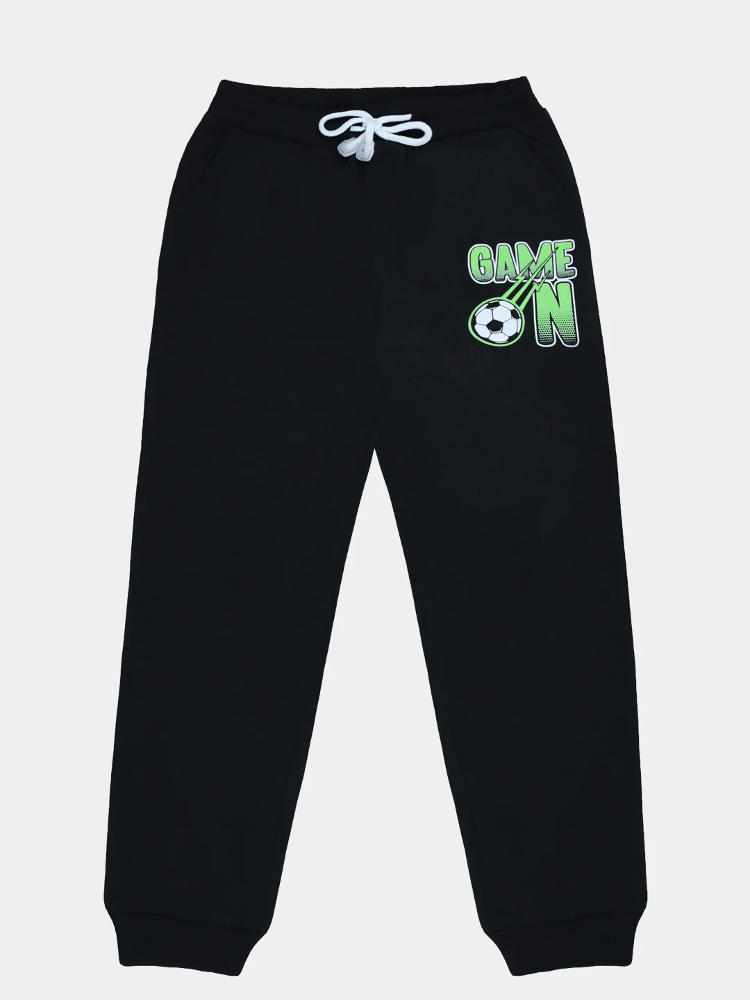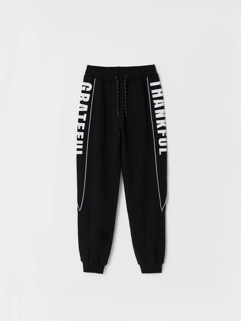 Оригинальные спортивные брюки выполнены из черного плотного трикотажа футер с боковыми карманами. Крой свободный. Декорированы фиксирующим шнуром и контрастными ярко коричневыми лампасами. Низ на манжетах. Подходят как универсальная одежда для игровых площадок, прогулок в прохладный сезон и как элемент спортивной одежды.р.116