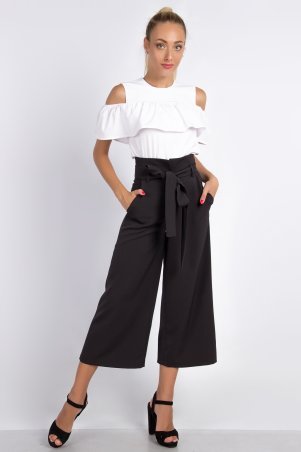 Прямые брюки со стрелками с высокой посадкой по талии на широком фигурном поясе. По бокам расположены косые карманы. В шлевки вставляется пояс. Длина изделия по боковому шву 109 см. По шаговому шву 76 см.