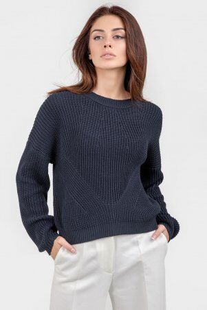 Классический силуэт, немного спущенное плечо, по боковому шву и горловине вывязана полоска контрастного цвета