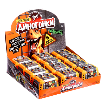 Опасные динозавры сбежали – кто первым придет к финишу? В этом инерционном наборе «Диногонки» спрятаны невероятные машинки с головами доисторических хищников! Открой клетку, отпусти динозавра и смотри, как он мчится вперёд!