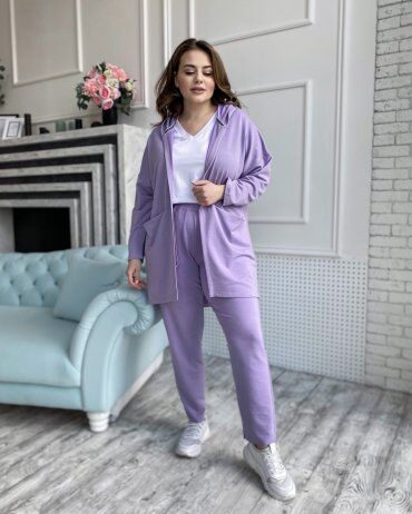 Брюки на широкой резинке с двумя функциональными карманами. Худи с капюшоном и впереди вместительный капрман