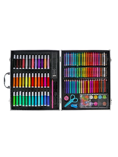 Набор состоит из: Набора цветных карандашей, акварельных красок с кистью, набора цветной пастели, восковых мелков, а так же широкий выбор цветных фломастеров. Для более удобной и продуктивной работы, в комплекте так же есть линейка, ножницы, ластик, степлер, точилка, корректор, кисть с полостью для воды, и простой карандаш. Широкий выбор канцтоваров для творчества и работы, стильный и удобный металлический портфель, отличный набор для опытного и начинающего художника