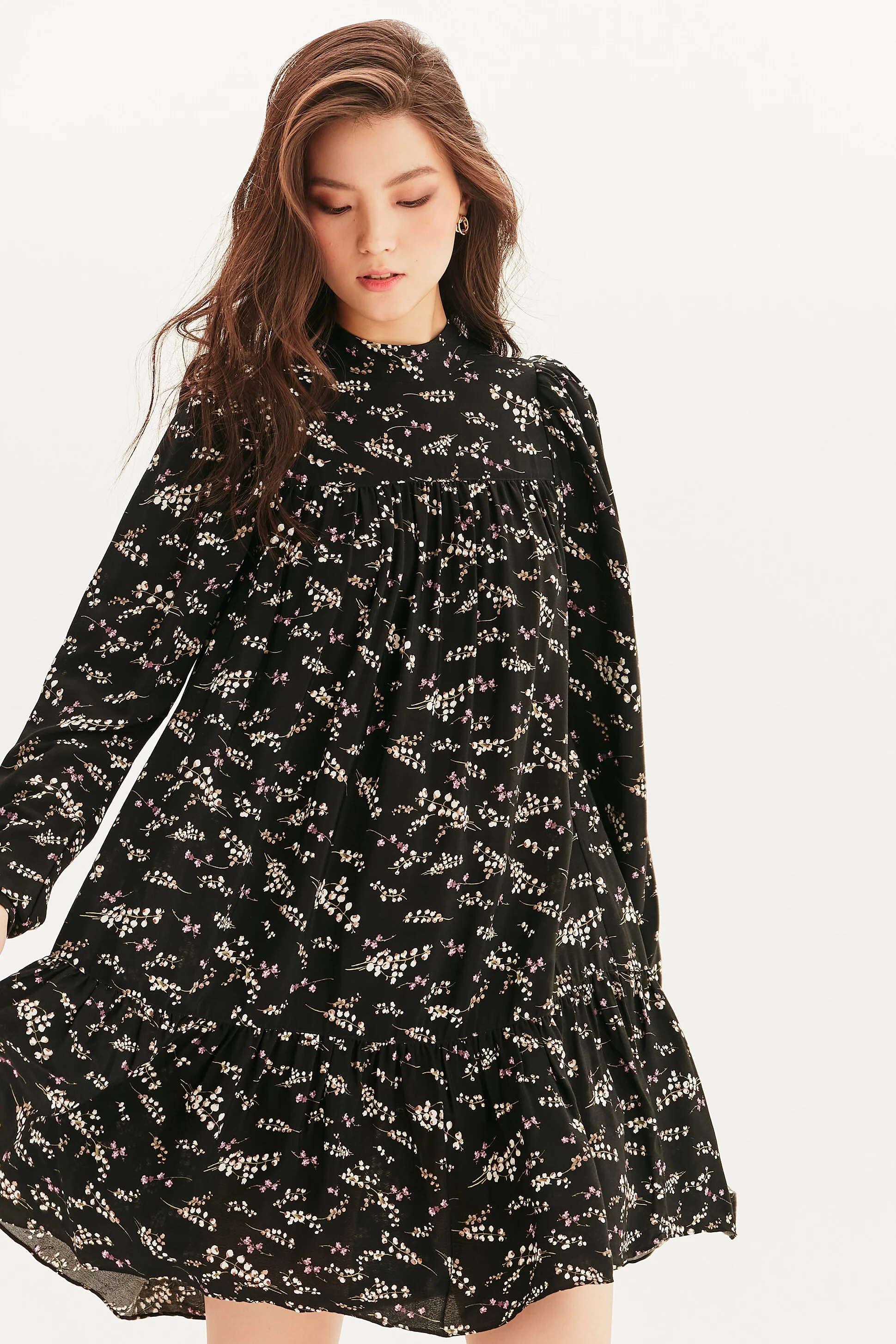 +Подробнее- Короткое платье свободного кроя с расклешенной ярусной юбкой