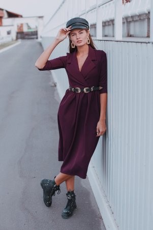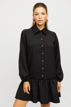 Платье длиной выше колена из легкой ткани, впереди неглубокий вырез, рукав длинный широкий с манжетами, по низу изделия волан; застежка: пуговица сзади