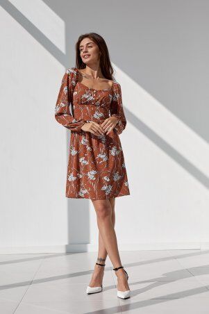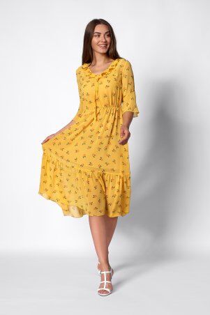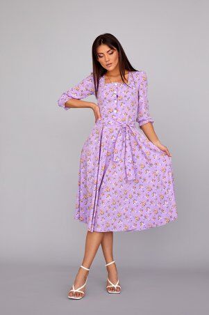 Платье ARTMON приталенное, юбка клеш с клиньями, длина миди. На лифе полочки выполнена сборка под грудью, спинка с талиевыми выточками. На талии широкий пришивной пояс. Рукава широкие, верхняя часть собраная на резинку и служит бретелью, низ рукава также собранный на резинку. По низу юбки отделочная строчка. Лиф полочки на подкладке.