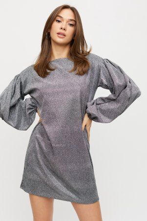 Платье длиной выше колена из легкой ткани, впереди неглубокий вырез, рукав длинный широкий с манжетами, по низу изделия волан; застежка: пуговица сзади