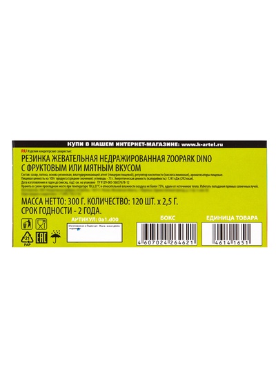 Минимальный заказ: 120.00шт.; Вес нетто, г: 3.5; tnved: 1704906200; Тематика праздника: Универсальная тематика; Вкус: Тутти-фрутти; Вкус: Мята; Форма: Пластина; РосЗакуп: Да; Температурное ограничение: Нет; Продукты: Да; Индивидуальная упаковка: Да; С жидким центром: Нет; Склад: КИУ 5; ШК WB: 2900108920959; ШК WB: 4607024264621; ШК WB: 6900108920955; Жевательная резинка с яркими вкусами — это отли... Подробнее...