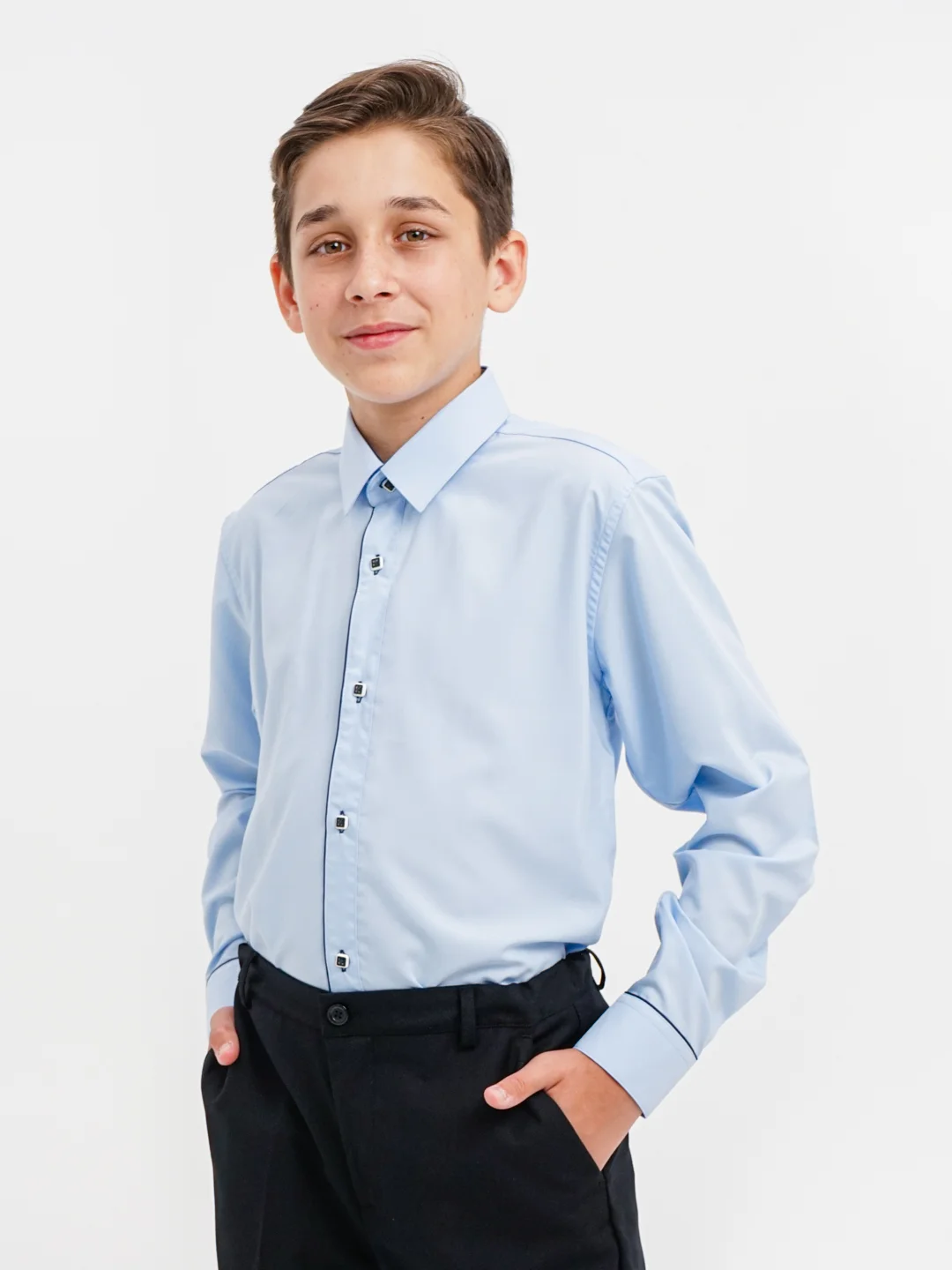 Модель полуприлегающего силуэта, с отложным воротником, длинными рукавами и манжетами на пуговицах. Фронтальная застежка на пуговицы. Закругленный подол. Рубашка будет отлично сочетаться с брюками, жакетами и жилетами из нашей школьной коллекции.